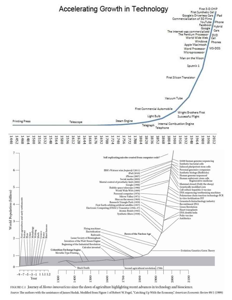 The following charts illustrate various representations regarding the accelerated growth of technology as technology always follows scientific discoveries as to how the nature of the reality of the Universe in which we live in works.