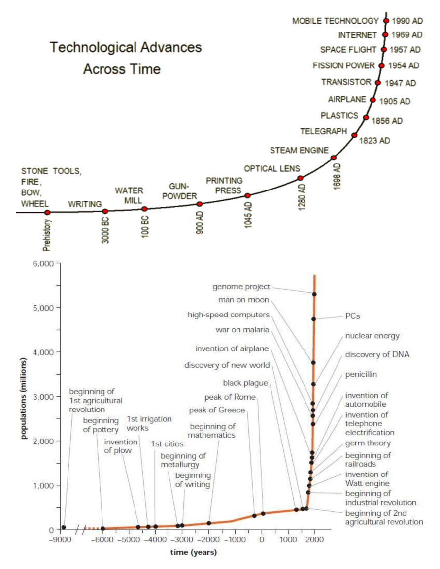 Notice how the exponential growth of technological development represents the collective accumulation of contributions of more and more scientists and engineers that are contributing to this overall growth....