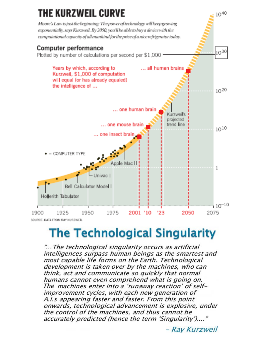 And finally, 'The Kurzweil Curve showing how the power of computational technology will keep growing exponentially up to the point of 'Technological Singularity' and beyond.